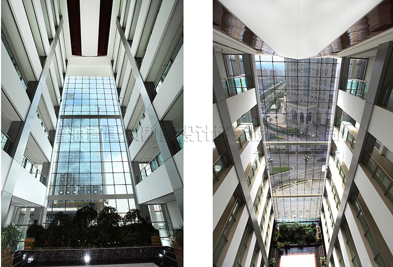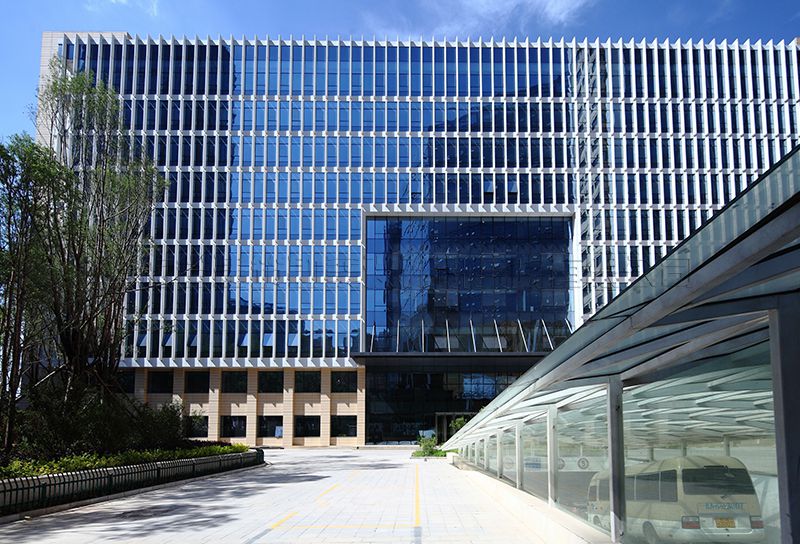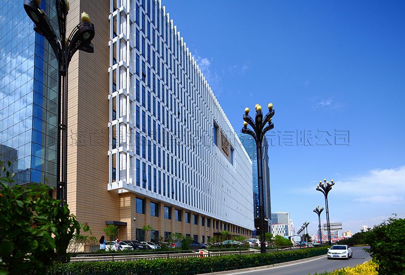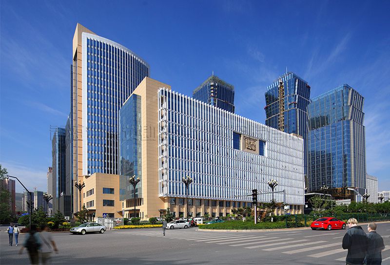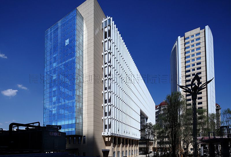 建筑體型:A區(qū)、B區(qū)一至四層為一個(gè)整體,內(nèi)部根據(jù)不同功能劃分平面。A區(qū)主樓平面呈矩形,B區(qū)主樓平面呈橄欖形,建筑立面窗采用玻璃幕墻及矩形窗的分隔方式,實(shí)體墻分為掛貼米色陶土板,立面豎向線條為鋁合金象牙白氟碳涂膜,立面設(shè)計(jì)手法現(xiàn)代、簡(jiǎn)潔、方正、大氣,達(dá)到良好的視覺(jué)效果,幕墻與實(shí)體墻比例劃分恰當(dāng),米色陶土板墻面分格細(xì)膩,具有高品質(zhì)現(xiàn)代辦公建筑的特征,成為西寧海湖新核心區(qū)有特點(diǎn)的標(biāo)志建筑。